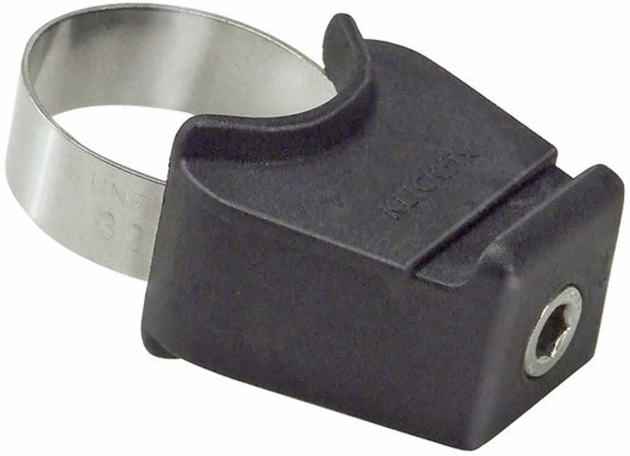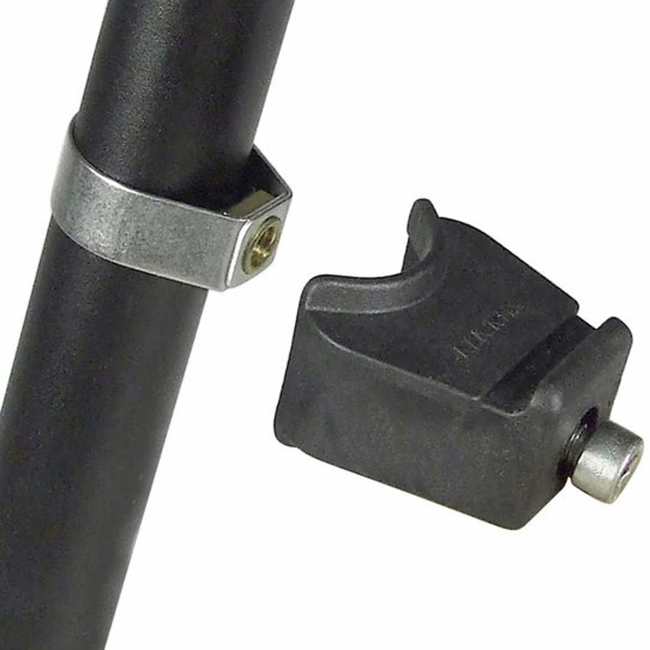 Der kompakte unauffällige Adapter zur Montage an allen üblichen Sattelstützen. So kann auch an Fahrrädern ohne Gepäckträger eine Tasche schnell und sicher befestigt werden. Komplett mit zwei Edelstahlschellen passend für Ø 25-28 und Ø 28-32mm. Schelle für oversized Sattelstützen Ø 32-36mm erhältlich. Da die rote Taste zubehörseitig am Taschenbügel befindlich ist, bleibt nur ein kleines unauffälliges Adapterstück am Sattel, wenn man ohne Tasche fährt.