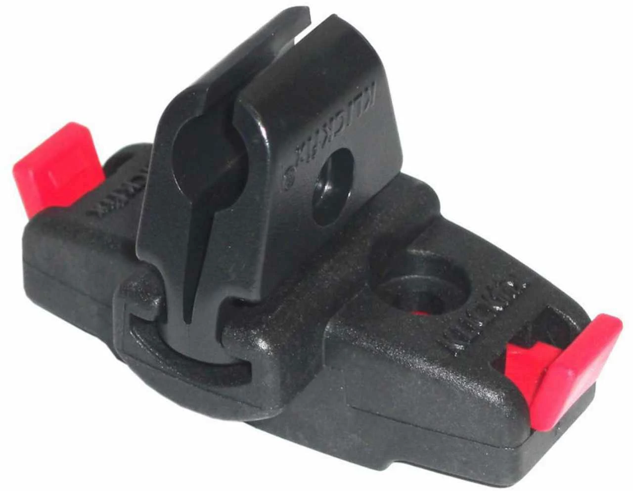 Zum Anklicken un Abnehmen von Seil- und Kabelschlössern Ø 6-10 mm an Renn- und Sportsätteln. Das kleine Klemmstück wird einfach am Schloss befestigt. Zum Abnehmen reicht es eine der beiden roten Tasten zu drücken.