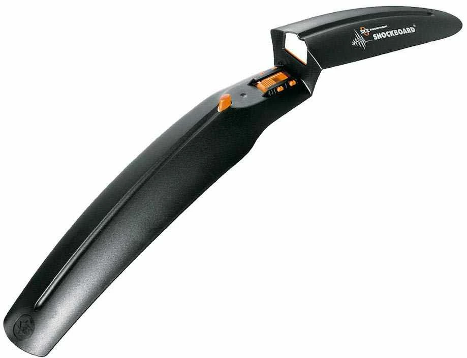 Die besondere Geometrie des Shockboards berücksichtigt den Federweg der Gabel ebenso wie die Freiheit im Pedalbereich. Das Shockboard lenkt mit, wobei sich das breite Profil ständig über dem Vorderreifen befindet. Auch bei hohen Geschwindigkeiten ist optimaler Spritzschutz garantiert. Das Profil aus bruchsicherem Kunststoff ist solide ausgesteift (kein Flattern) und dennoch extrem leicht (110g).